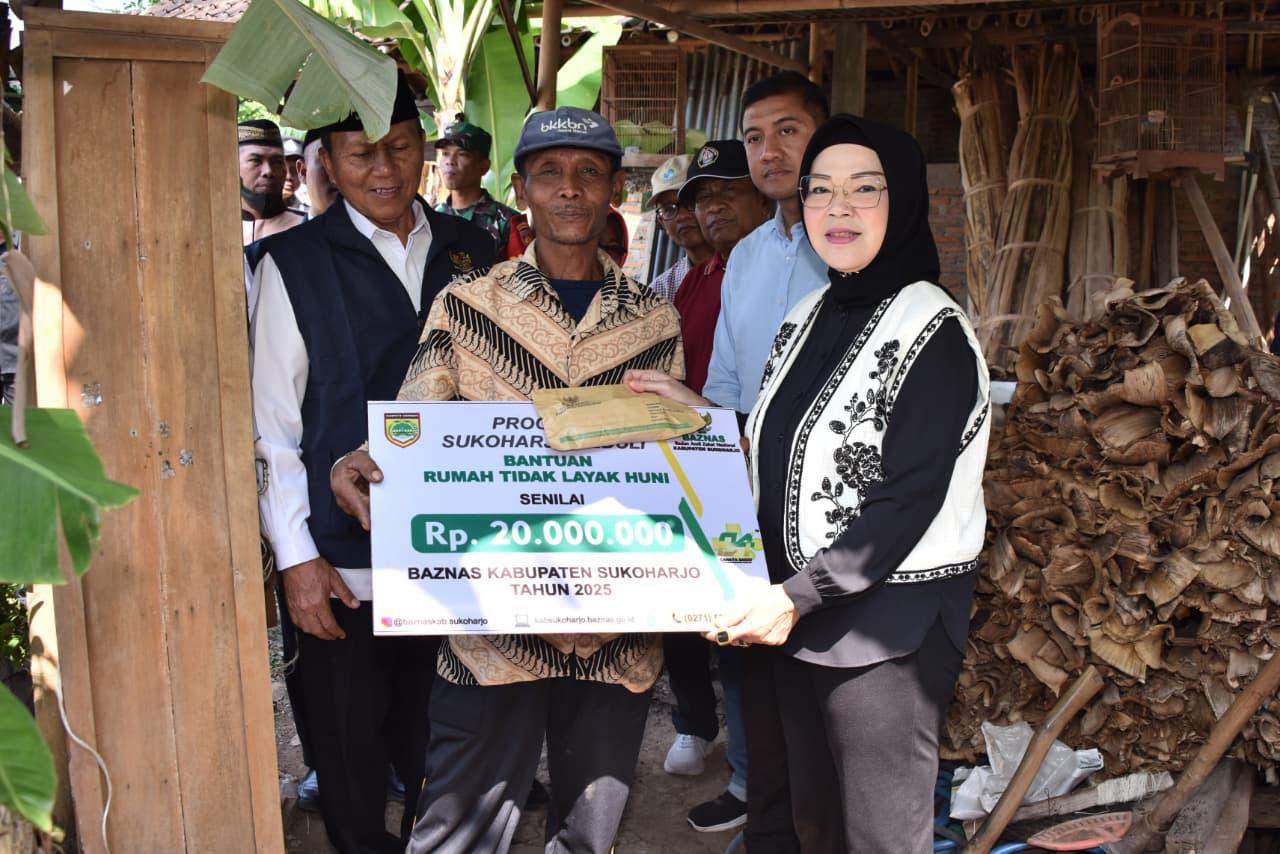 SUKOHARJO – Bupati Sukoharjo, Etik Suryani, Wakil Bupati, Eko Sapto Purnomo bersama Badan Amil Zakat Nasional (Baznas) kembali menyalurkan bantuan rehab Rumah Tidak Layak Huni (RTLH) di tiga kecamatan, Jumat (5/9/2025). Penyerahan bantuan ini diberikan kepada delapan penerima.