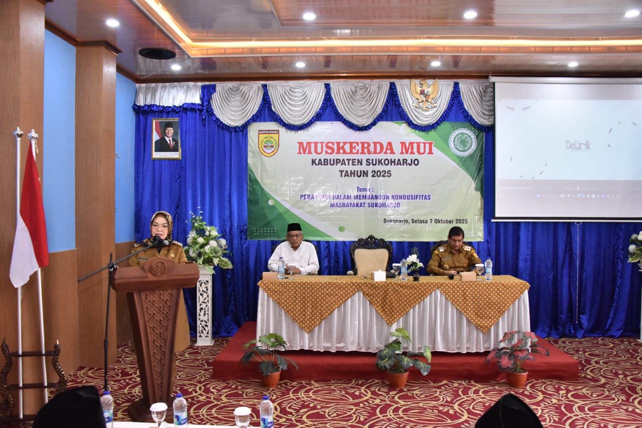 SUKOHARJO – Bupati Sukoharjo, Etik Suryani bersama Wakil Bupati (Wabup), Eko Sapto Purnomo menghadiri Musyawarah Kerja Daerah (Mukerda) Majelis Ulama Indonesia (MUI) Kabupaten Sukoharjo. Acara tersebut dilaksanakan di Hotel Hapsari, Selasa (7/10/2025).