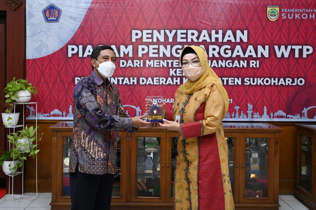 SUKOHARJO – Opini Wajar Tanpa Pengecualian (WTP) dari Badan Pemeriksa Keuangan (BPK) kembali diraih Pemkab Sukoharjo untuk Laporan Keuangan Pemerintah Daerah (LKPD) tahun 2020. Opini WTP untuk LKPD tahun 2020 tersebut merupakan opini WTP ke-6 berturut-turut sejak tahun 2015. Plakat serta piagam penghargaan tersebut diserahkan oleh Kepala Kantor Pelayanan Perbendaharaan Negara (KPPN) Surakarta, Hartana, pada Bupati Sukoharjo, Etik Suryani, di Lobi Kantor Bupati, Selasa (19/10/2021).
