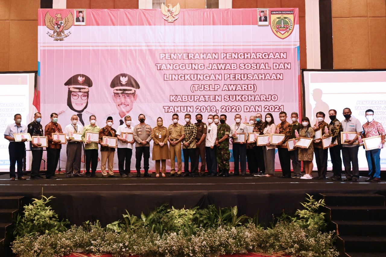 SUKOHARJO – Sebanyak 19 perusahaan meraih penghargaan dalam ajang TJSLP Award 2022 yang digelar oleh Badan Perencanaan, Penelitian, dan Pengembangan Daerah (Bappelbangda). Penyerahan penghargaan dilakukan oleh Bupati Sukoharjo, Etik Suryani di Hotel Best Western Solo Baru, Senin (30/5/2022). Hadir juga dalam acara Wakil Bupati, Agus Santosa dan pejabat Forum Koordinasi Pimpinan Daerah (Forkopimda).